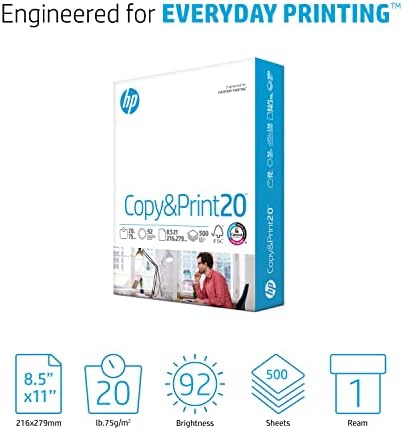 About this item HP Papers is sourced from renewable forest resources and has achieved production with 0% deforestation in North America. Each ream is wrapped in a polyurethane coated paper wrapper to protect the cut sheets from moisture damage Sheet size – 8.5 x 11; Thickness – 20 pounds; Brightness – 92 bright white HP Copy&Print20 20 pounds printer paper is Forest Stewardship Council (FSC) certified and contributes toward satisfying credit MR1 under LEED (Leadership in Energy and Environmental Design) All HP Papers provide premium performance on HP equipment, as well as on all other printer and copier equipment; 100% satisfaction guaranteed; ColorLok technology provides more vivid colors, bolder blacks and faster drying Superior quality, reliability, and dependability for high-volume printing at home, at school and in the office; HP Copy&Print20 print and copy paper prevents yellowing over time to ensure a long-lasting appearance for added archival quality